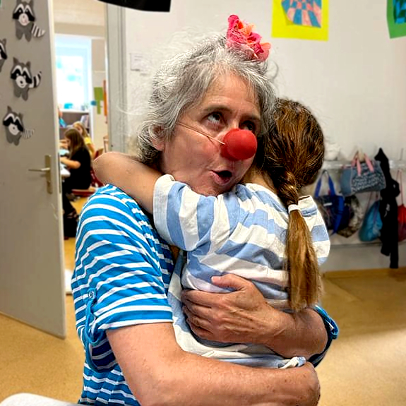 Sie kommt unerwartet und überrascht die Kinder mit lustigen improvisierten Spielen, mit Liedern, Gedichten und Rätseln. Modelierballons oder Einweghandschuhe werden aufgeblasen und zu Figuren geformt, Seifenblasen steigen auf, und die Wellen des EKG werden zu einem großen Meer und das Bett zum Schiff.